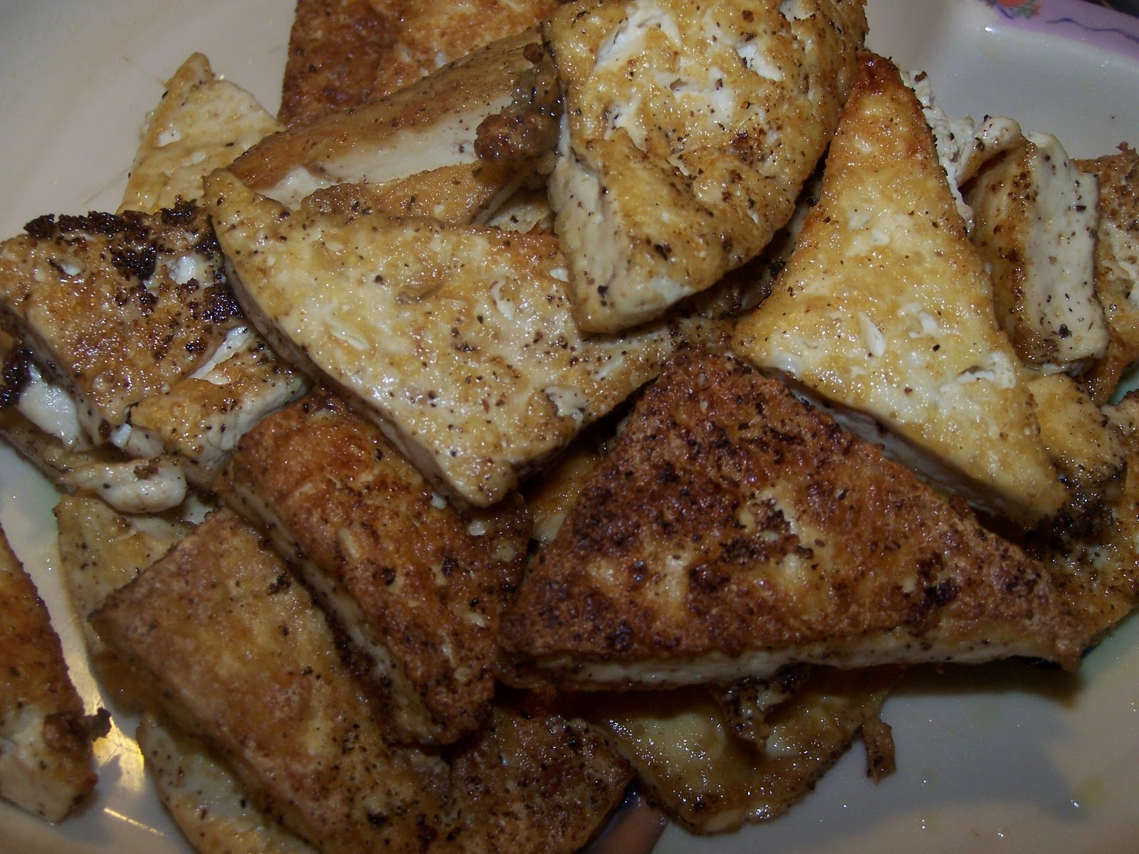 Anyway, here is the tofu in all of its glory. I like to pepper my tofu while it cooks. Hehehehehehehehe, that is a Beauty and The Beast plate XD......